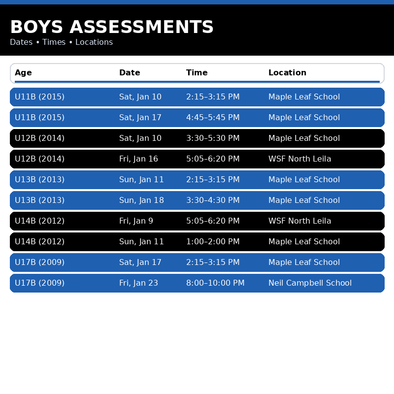 Please Review Time slots below or email info@manitobarushfc.com for assessment details if you have not received information.